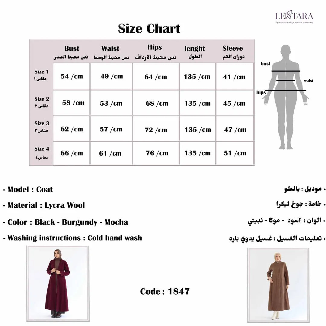 This women’s modest and elegant long coat is crafted from lycra wool fabric, offering soft warmth, gentle stretch, and a refined structured look. The full-length design provides comfortable coverage and a clean silhouette, making it ideal for everyday modest wear in the colder season.