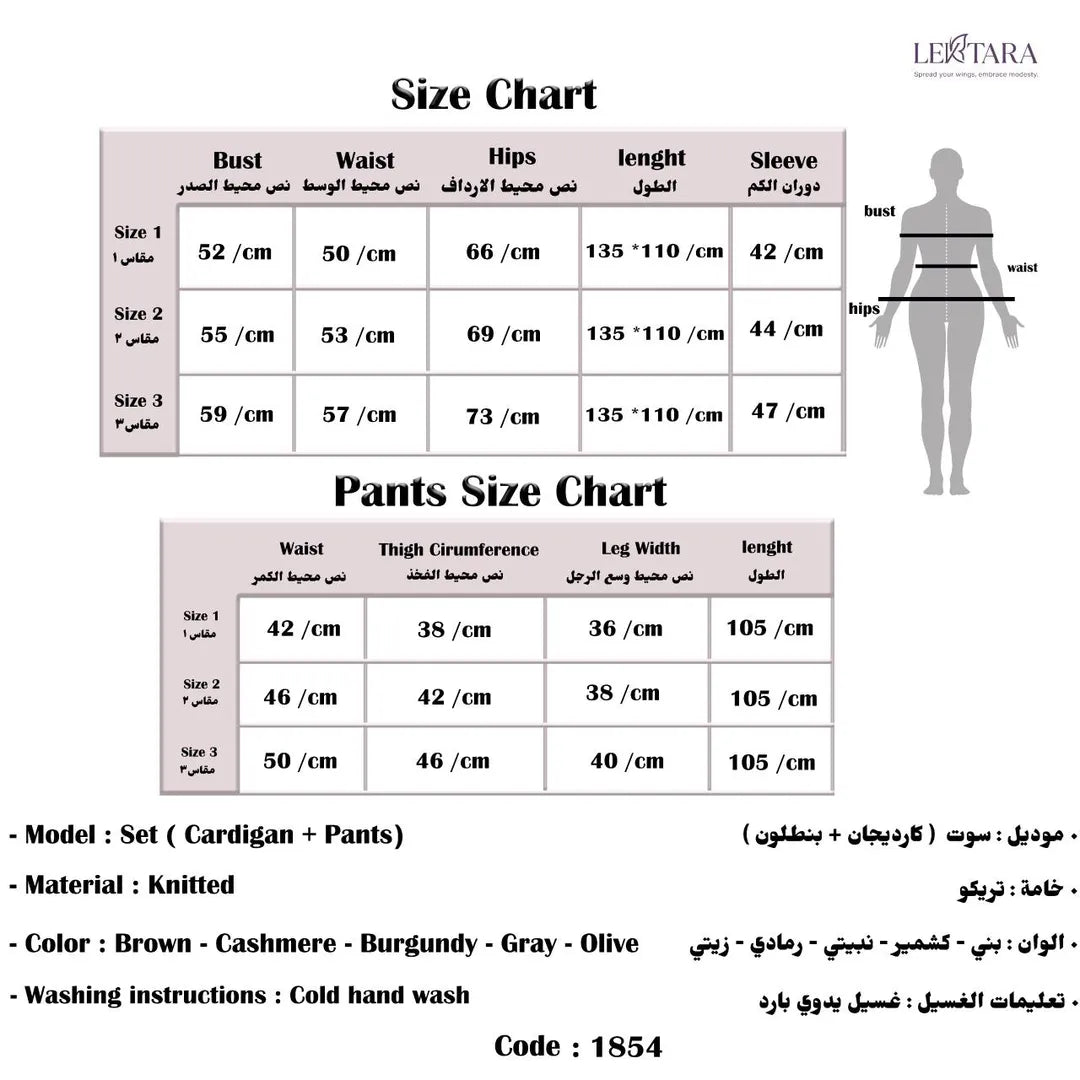 الطقم مكوّن من كاردجان محاك متصمم للّبس بطبقات، ومعاه بنطلون متناسق بيكمل الإطلالة بشكل منظم. القصّة المريحة بتدي حرية حركة، وفي نفس الوقت بتحافظ على شكل مرتب يناسب اللبس لفترات طويلة خلال اليوم.