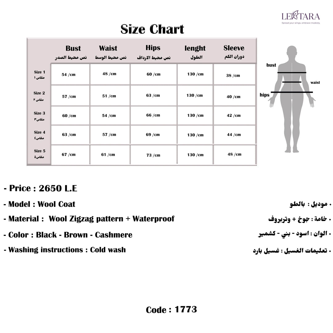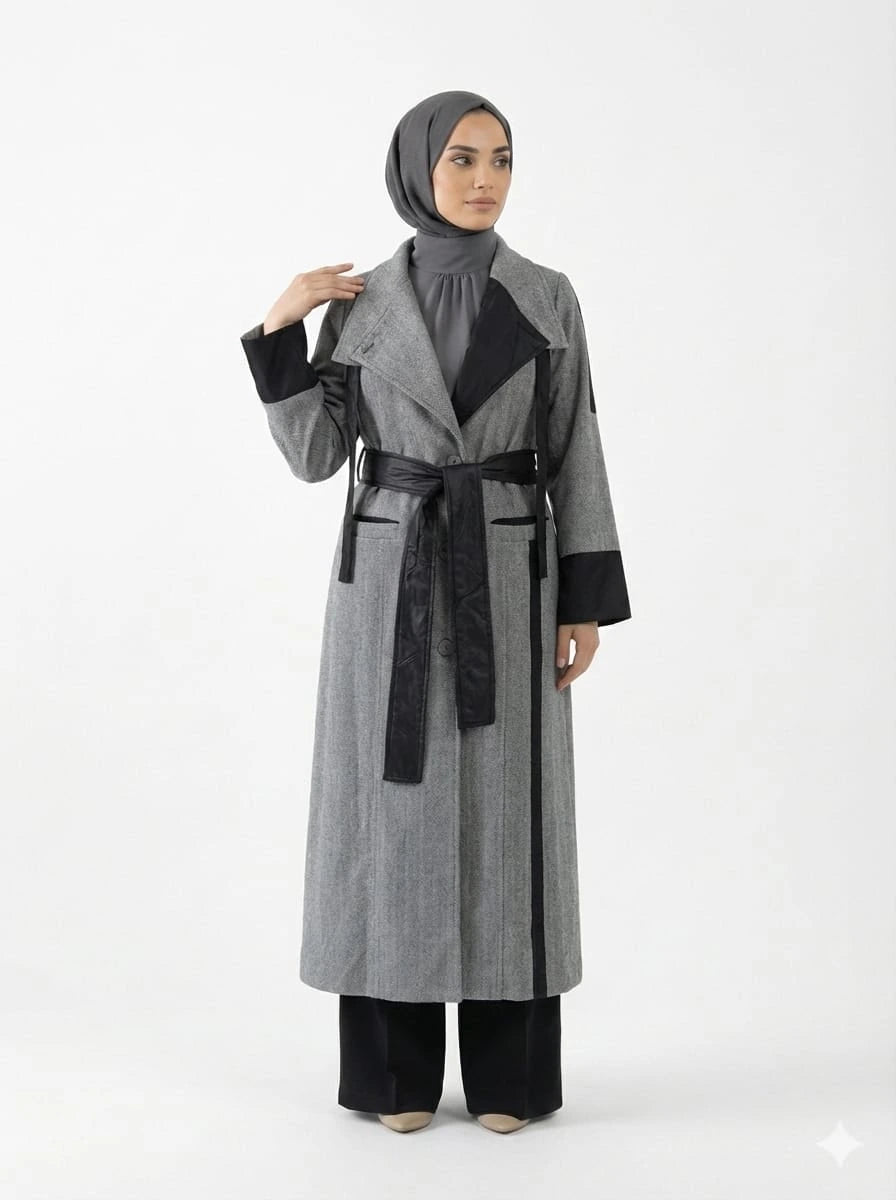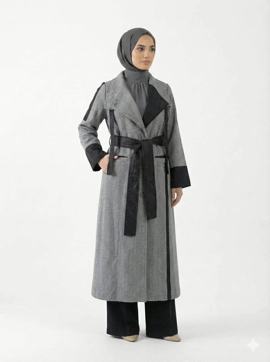 يُعد هذا البالطو الترنش الصوفي خيارًا عمليًا لمن تبحث عن قطعة خارجية شتوية محتشمة تجمع بين الهيكل الأنيق والحماية من الطقس البارد. خامة الصوف بنقشة متعرجة مع معالجة مقاومة للماء تمنح دفئًا مناسبًا مع مظهر منظم يناسب ملابس شتاء محتشمة.