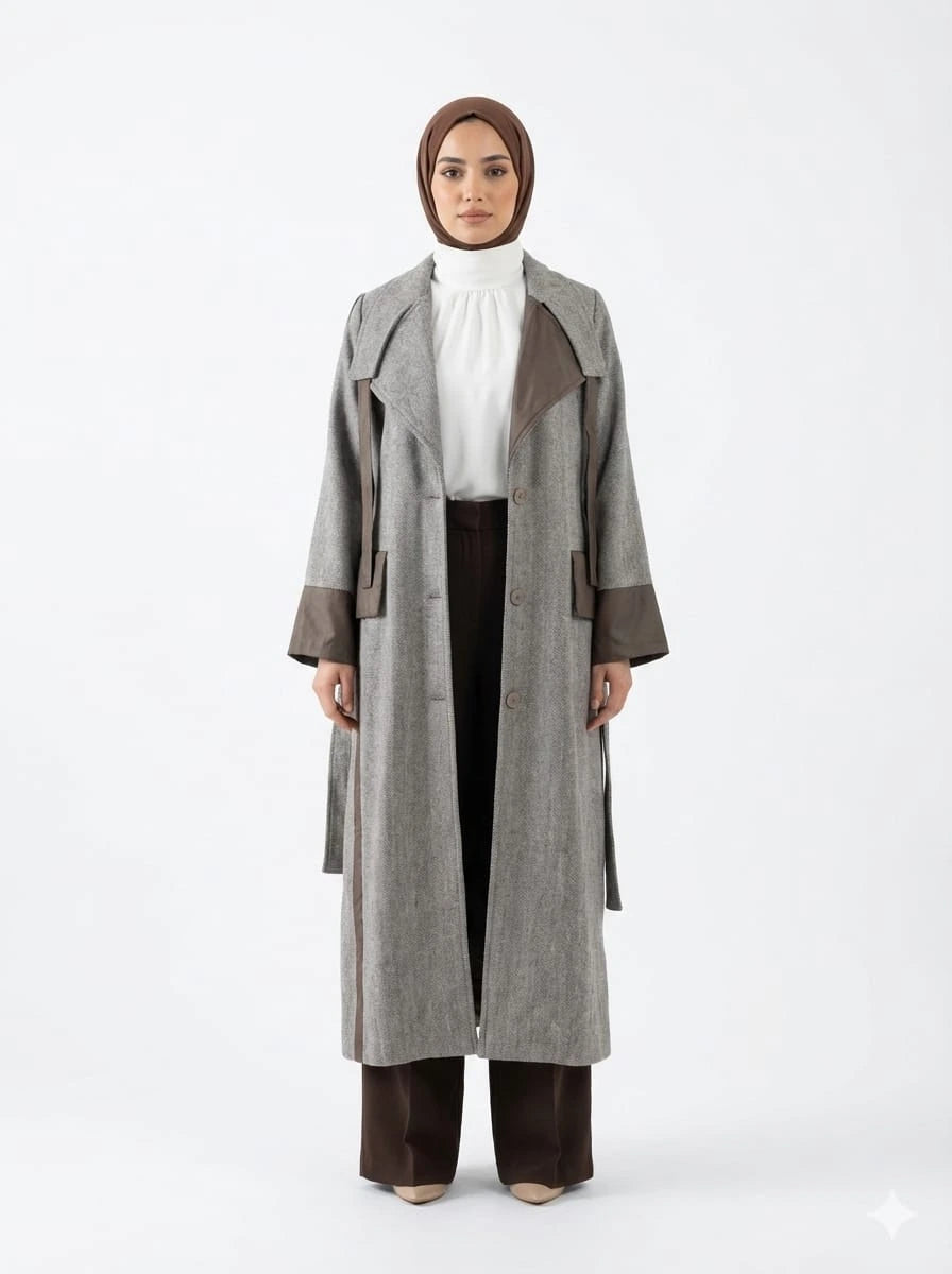 إذا كنتِ تتساءلين ما هو أفضل بالطو لملابس شتاء محتشمة، فإن الترنش الصوفي يوفر توازنًا بين العملية والأناقة. كما أن الطول والخطوط المستقيمة يجعلان تنسيقه مع الحجاب سهلًا ومتناسقًا دون إضافة حجم زائد.