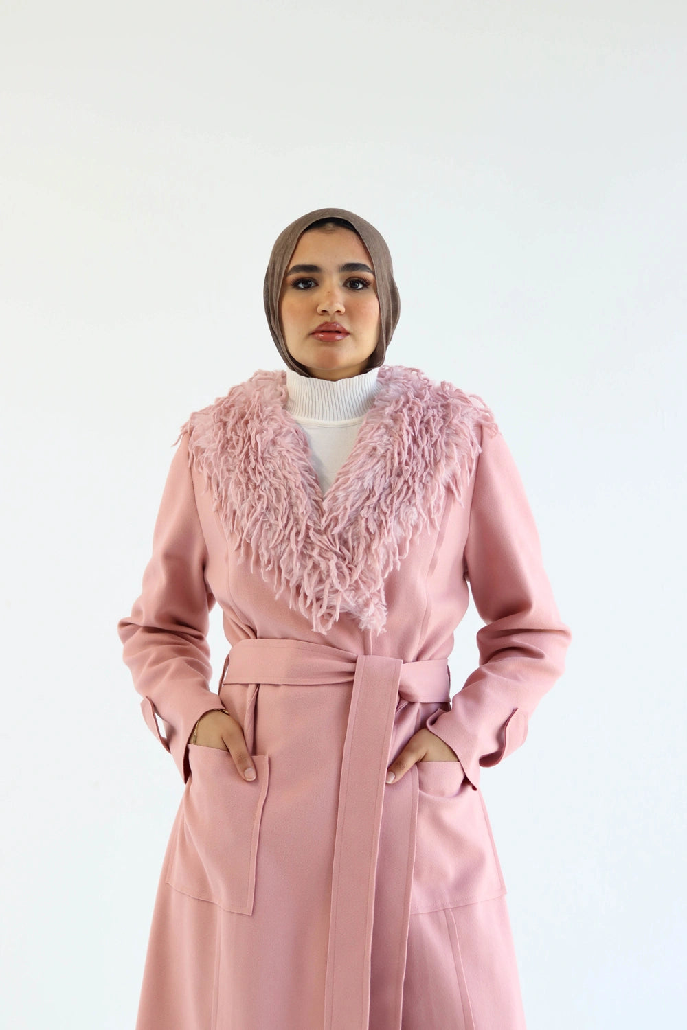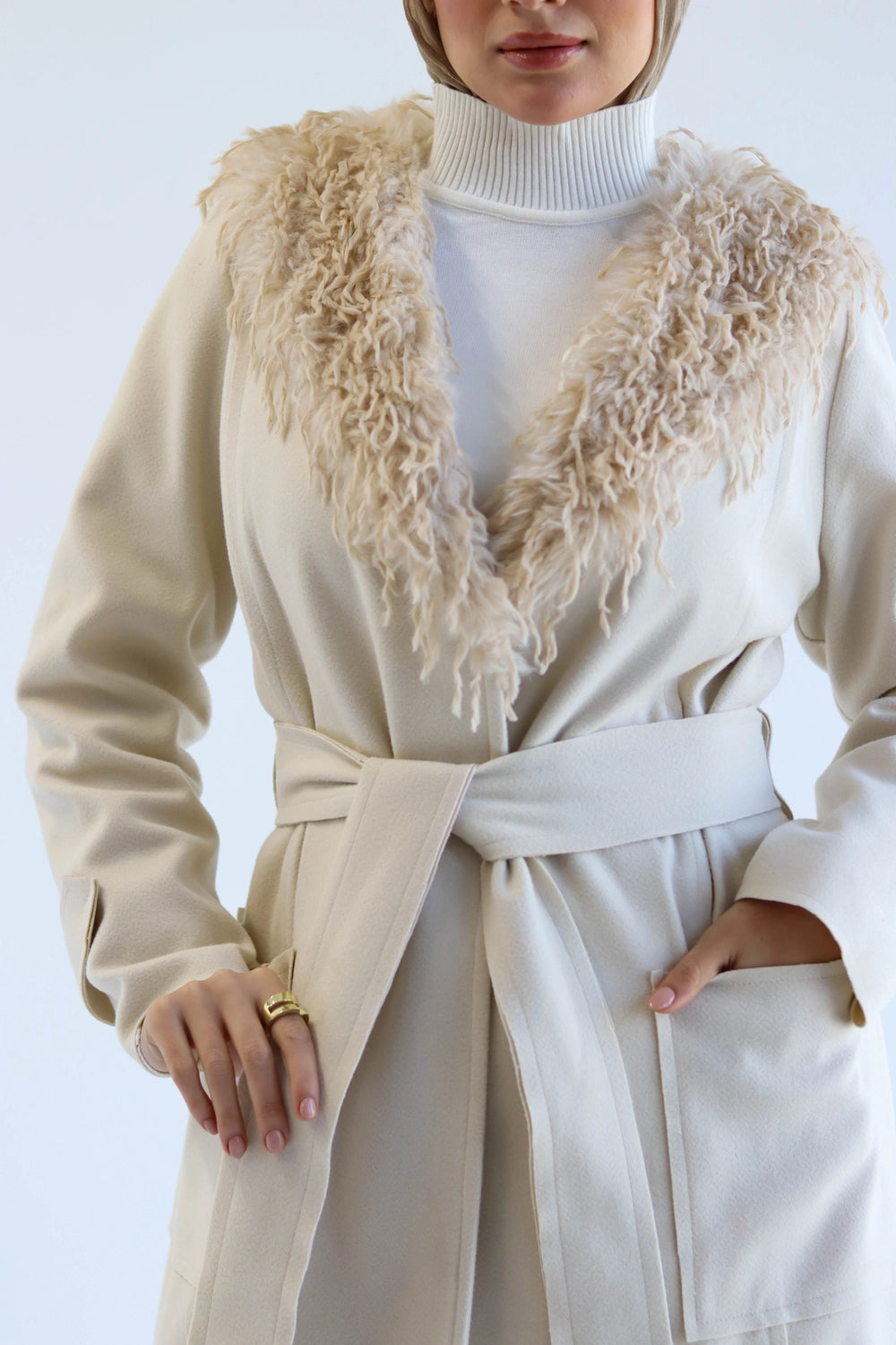 Crafted from a combination of fur and wool, the coat provides insulation while maintaining a soft, luxurious feel. The structured cut allows easy layering over dresses, sets, or everyday outfits, making it suitable for both daily wear and elevated seasonal looks. This style works well for winter outfits, formal gatherings, and elegant modest styling.