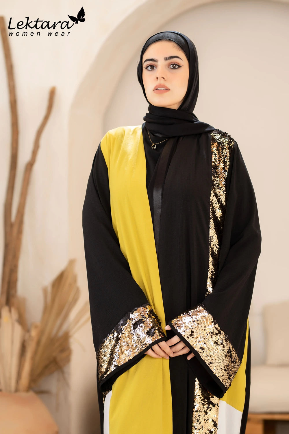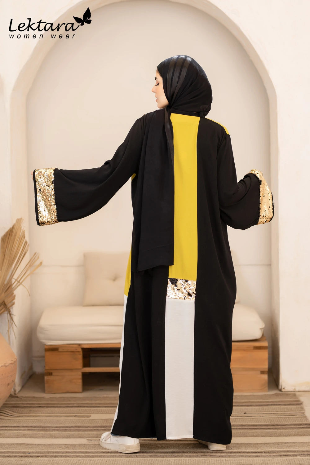 This long crepe kaftan features a flowing full-length silhouette crafted from premium high crepe fabric, offering structure with graceful movement. The design is elevated by a striking contrast panel and shimmering sequin detailing along the side, creating a sophisticated balance between modern modest fashion and subtle glamour.