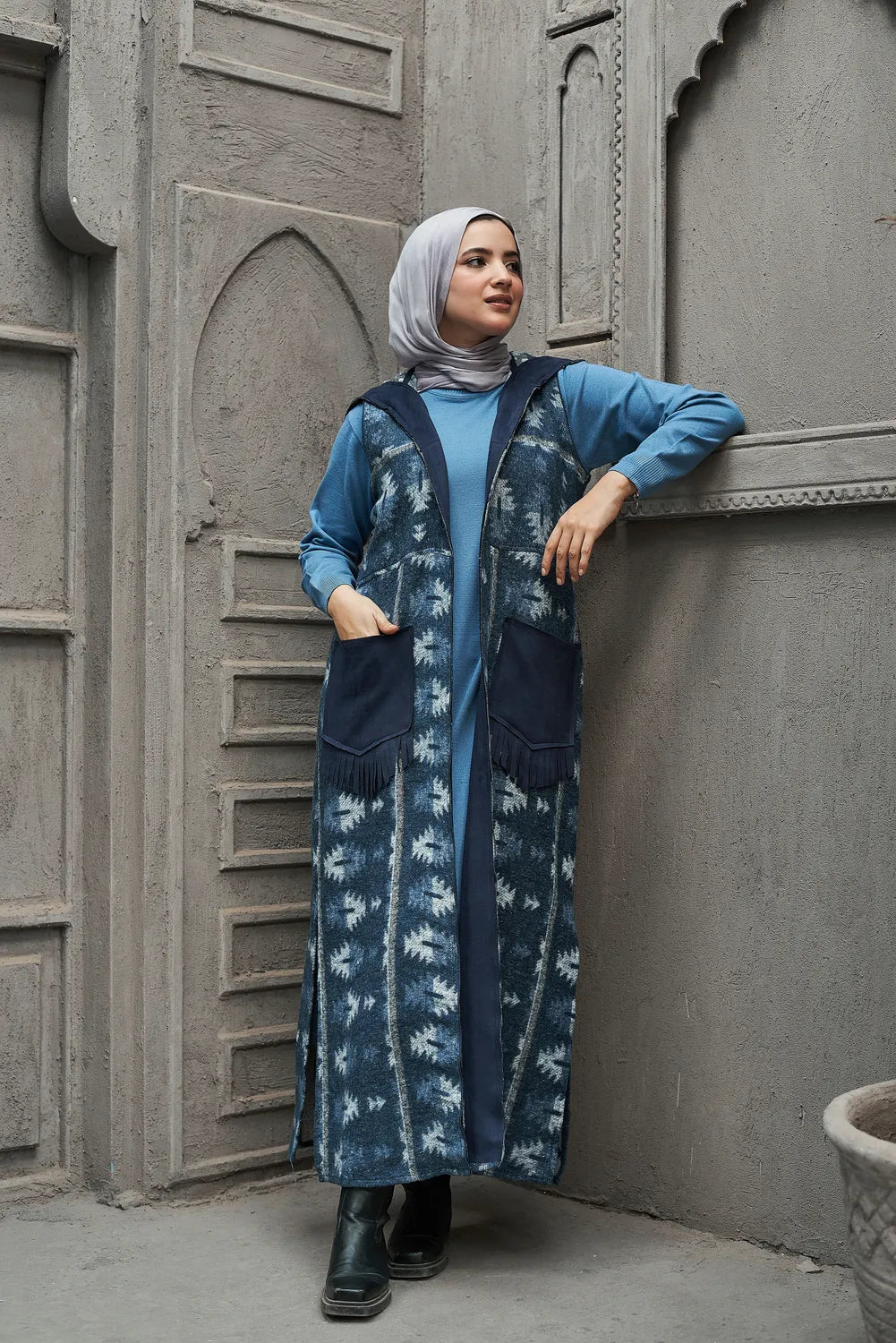 This sleeveless suede cardigan is crafted from a warm felt-lycra blend with smooth suede accents, giving it a soft, comfortable, and elegant feel. The open-front design layers easily over tops and dresses, while the clean longline silhouette adds a refined touch.