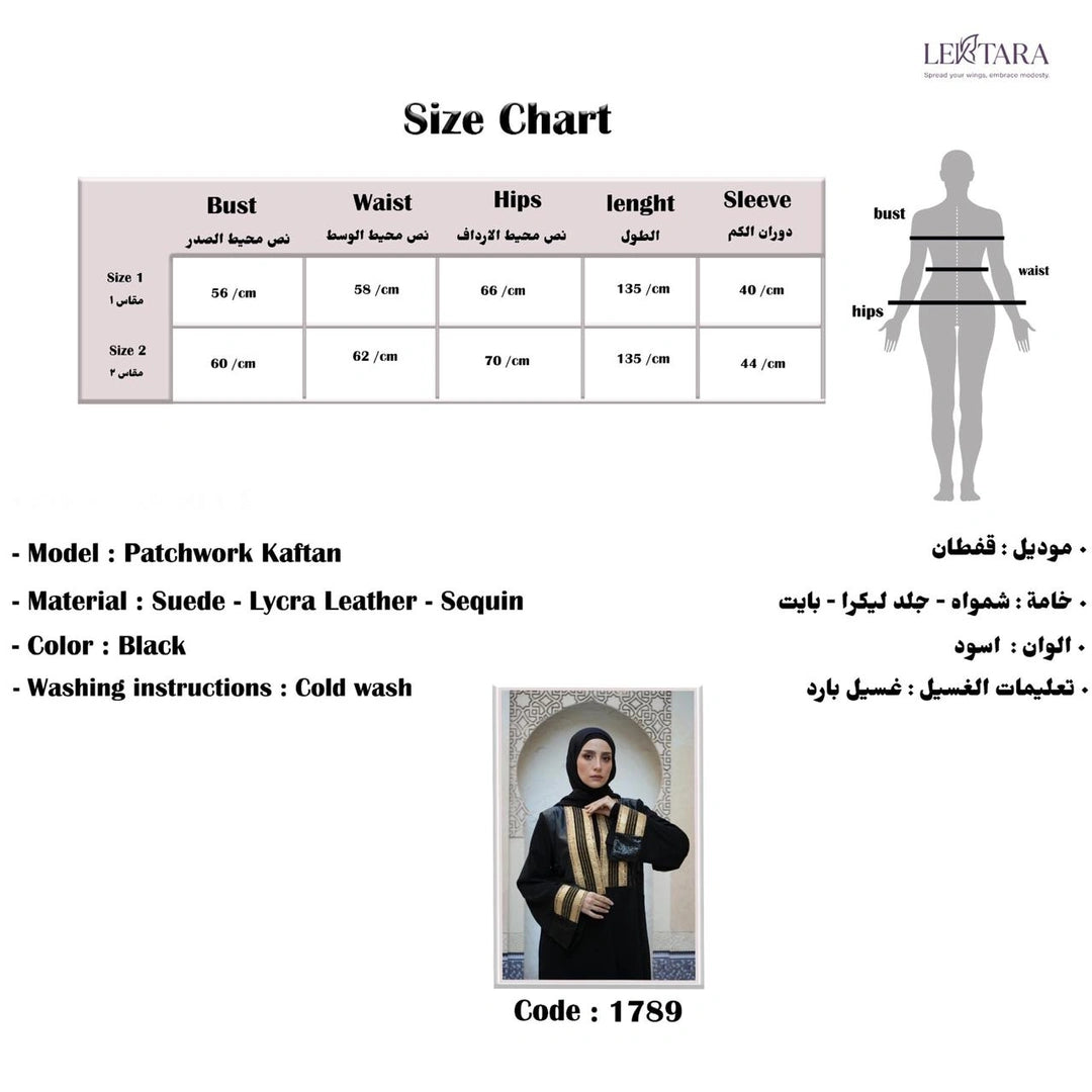 The Patchwork Kaftan features a flowing black silhouette accented with a distinctive patchwork design that combines suede, lycra leather, and sequin detailing. The contrast textures create visual depth while preserving a sophisticated and understated aesthetic. The design includes long sleeves and a closed neckline, providing full coverage with clean, elegant lines.