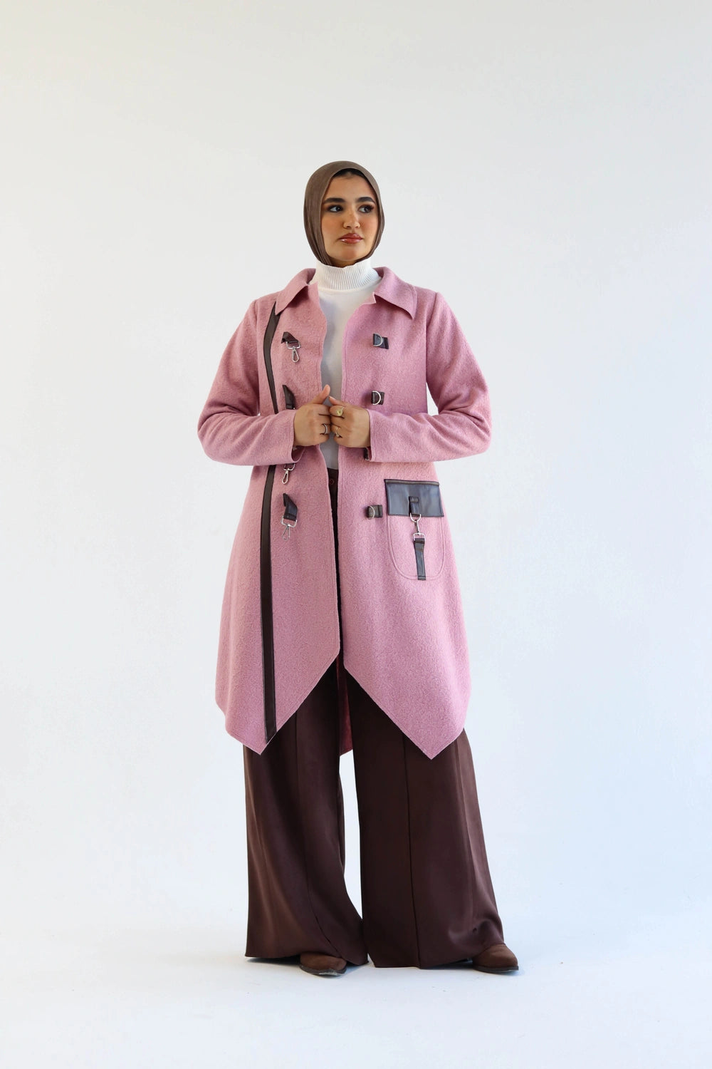 Functional front pockets with flap accents are integrated seamlessly into the design, offering practicality without compromising the jacket’s refined appearance. The long-sleeve cut and structured shape make this jacket suitable for winter outfits, formal daytime looks, and elegant modest styling. It pairs well with trousers, skirts, and layered sets for versatile seasonal wear.